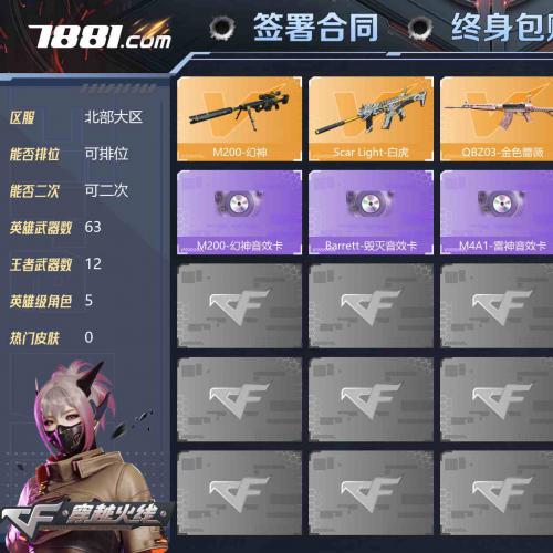 【可二次 英雄武器数量:63 英雄角色数量:5 王者武器数量:12 王者春,王者魅影 M4A1-雷神音效卡,AK47-火麒麟音效卡,Barrett-毁灭音效卡,M200-幻神音效卡 稀有武器:2个 生化号,爆破号,六盘龙,六烈龙】【★找回包赔★北部4051】:北部北京一区-57V-可二次**-【Lv.102.荣耀元帅】-【段位:荣耀之巅】M200-幻神/幻神-周瑜皮肤/AWM-裁决(2)/ScarLight-白虎/QBZ03-金色蔷薇/COP357-雷霆王者-觉醒版/HK417-朱雀/汤姆逊-烈龙(6)/RPK-盘龙(6)/炼狱-悦蓝/M4A1-黑骑士/M200-幻神音效卡/Barrett-毁灭音效卡/王者春/高爆手雷-雷霆/闪光弹-雷霆/烟雾弹-雷霆(截图展示段位不代表实际段位,如赛季更新等不可抗拒因素发生变化,其余道具看截图或咨询客服)